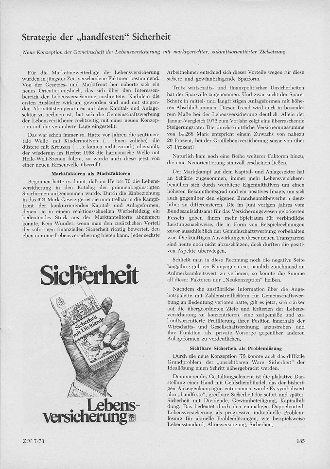 15. Mai 2020Die Zeitschrift für Versicherungswesen feiert in diesem Jahr ihren 70. Geburtstag. Im Juni erscheint aus diesem Anlass eine Jubiläumsausgabe mit einem großen Rückblick auf sieben Jahrzehnte Versicherungsgeschichte. Als Einstimmung auf das Jubiläum veröffentlichen wir in den kommenden Heften ausgewählte Artikel aus 70 Jahren ZfV. Kommen Sie mit uns auf eine Zeitreise in die bewegte Vergangenheit der Bundesrepublik Deutschland und der deutschen Versicherungswirtschaft. Heute geht es ins Jahr 1973. (S. gegenüberliegende Seite aus der ZfV Nr. 7/1973.) Damals machten sich die deut- schen Lebensversicherer Gedanken über einen neuen Marketingauftritt. Sie erfanden den berühmten Slogan „Sicherheit mit Dividende”, der über viele Jahre fast sprichwörtlich zum Leitmotiv des Altersvorsorgesparens mit Lebensversicherun- gen wurde. Inzwischen ist es in Zeiten der Zinskrise mit der Dividende nicht mehr so weit her in klassischen Policen – aber Sicherheit ist immer noch das zentrale Argument für den Abschluss einer Lebensversicherung.….