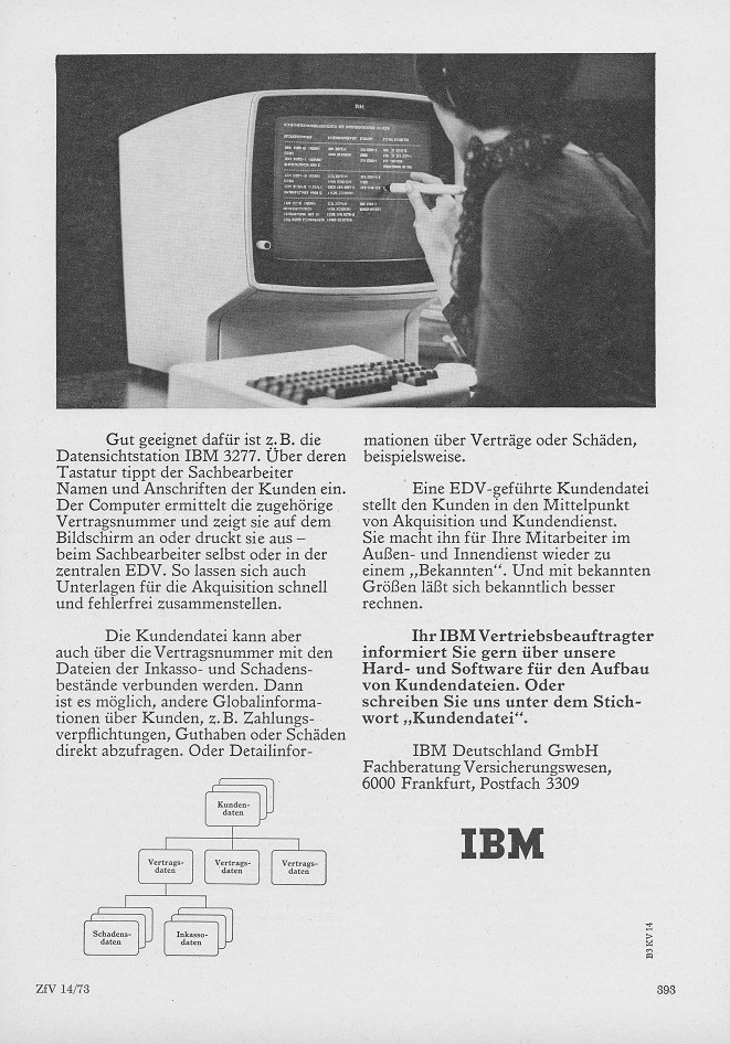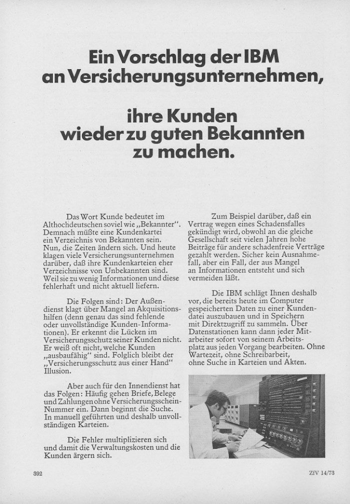 1. Juni 2020Die Zeitschrift für Versicherungswesen feiert in diesem Jahr ihren 70. Geburtstag. Im Juni erscheint aus diesem Anlass eine Jubiläumsausgabe mit einem großen Rückblick auf sieben Jahrzehnte Versicherungsgeschichte. Als Einstimmung auf das Jubiläum veröffentlichen wir in den kommenden Heften ausgewählte Artikel aus 70 Jahren ZfV. Kommen Sie mit uns auf eine Zeitreise in die bewegte Vergangenheit der Bundesrepublik Deutschland und der deutschen Versicherungswirtschaft. Heute geht es 47 Jahre zurück – ins Jahr 1973 (aus ZfV 14/1973). Die Anzeige von IBM zeigt, dass man schon damals über Probleme nachdachte, die bis heute nicht gelöst sind: Wie kann man die gesammelten Kundendaten so aufbereiten, dass Versicherer und Vermittler sie für eine optimale Betreuung der Kunden nutzen können? Damals war der Umstieg auf elektronische Speicherung von Informationen eine revolutionäre Neuerung. Heute, im Zeitalter der digitalen Revolution, geht es darum, die im Übermaß vorhandene Daten aus den Systemen der Versicherer zusammenzuführen und neu zu nutzen. Und der Fortschritt von damals (IBM-Systeme) ist heute der Hemmschuh bei der Digitalisierung (IBM-Altsysteme).….