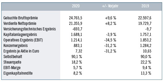 Die Bruttoprämie stieg insgesamt um 9,6% auf 24,8 Mrd. Euro (währungskursbereinigt +12,0%). Die verdiente Nettoprämie wuchs um 8,2% auf 21,4 Mrd. Euro (+10,6%). Das operative Ergebnis (EBIT) ging um 34,5% auf 1.214,1 Mio. Euro (1.853,2 Mio. Euro) zurück. Die Kapitalbedeckungsquote lag zum 31. Dezember 2020 bei 235,2%.